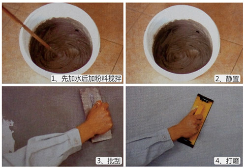 施工 | 先在容器中加入清水,按比例加入膩?zhàn)臃哿?;使用電?dòng)攪拌機(jī)攪拌,混合比例﹙粉料:水﹦25:8.5﹚;充分?jǐn)嚢?-10分鐘至均勻,沒(méi)有顆粒,靜置3-5分鐘,再攪拌一次即可使用;通常膩?zhàn)优谓ㄗh采用抹刀進(jìn)行施工,已獲得細(xì)膩平整的表面 |